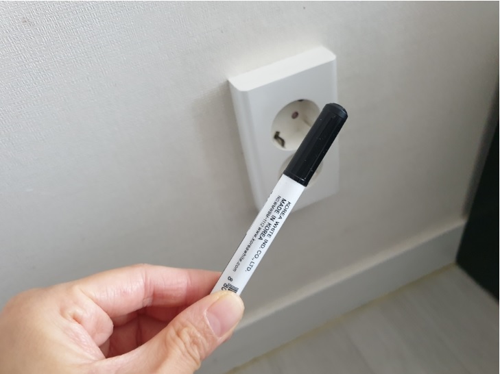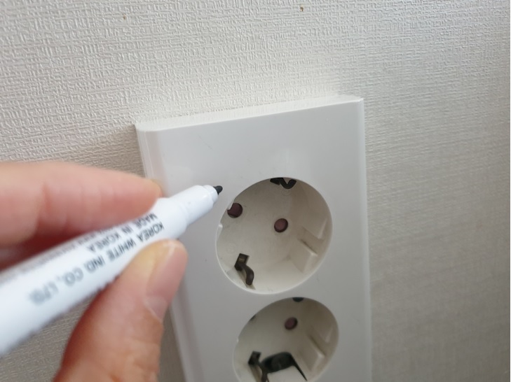 네임펜으로 콘센트 구멍의 각도를 살짝 표시해 주세요