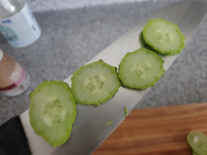 수분기가 많은 오이는 칼에 덕지덕지 달라붙지요