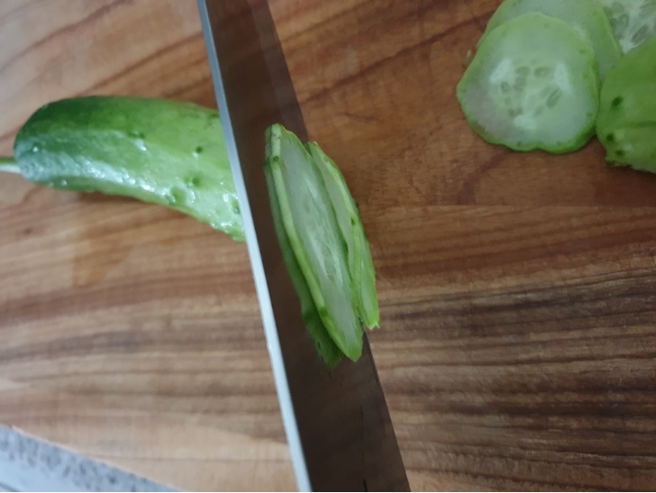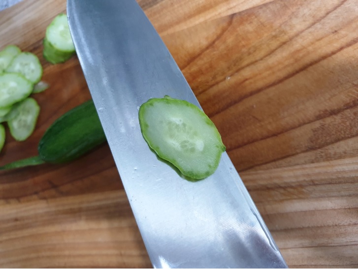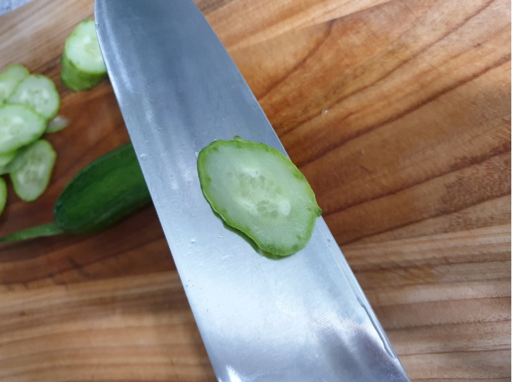 칼에 붙어 있는 오이가 다음 써는 오이를 바깥쪽으로 밀어내서