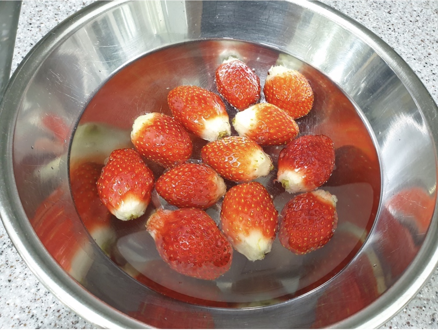 딸기가 전부 잠길 수 있게 물에 담가줍니다