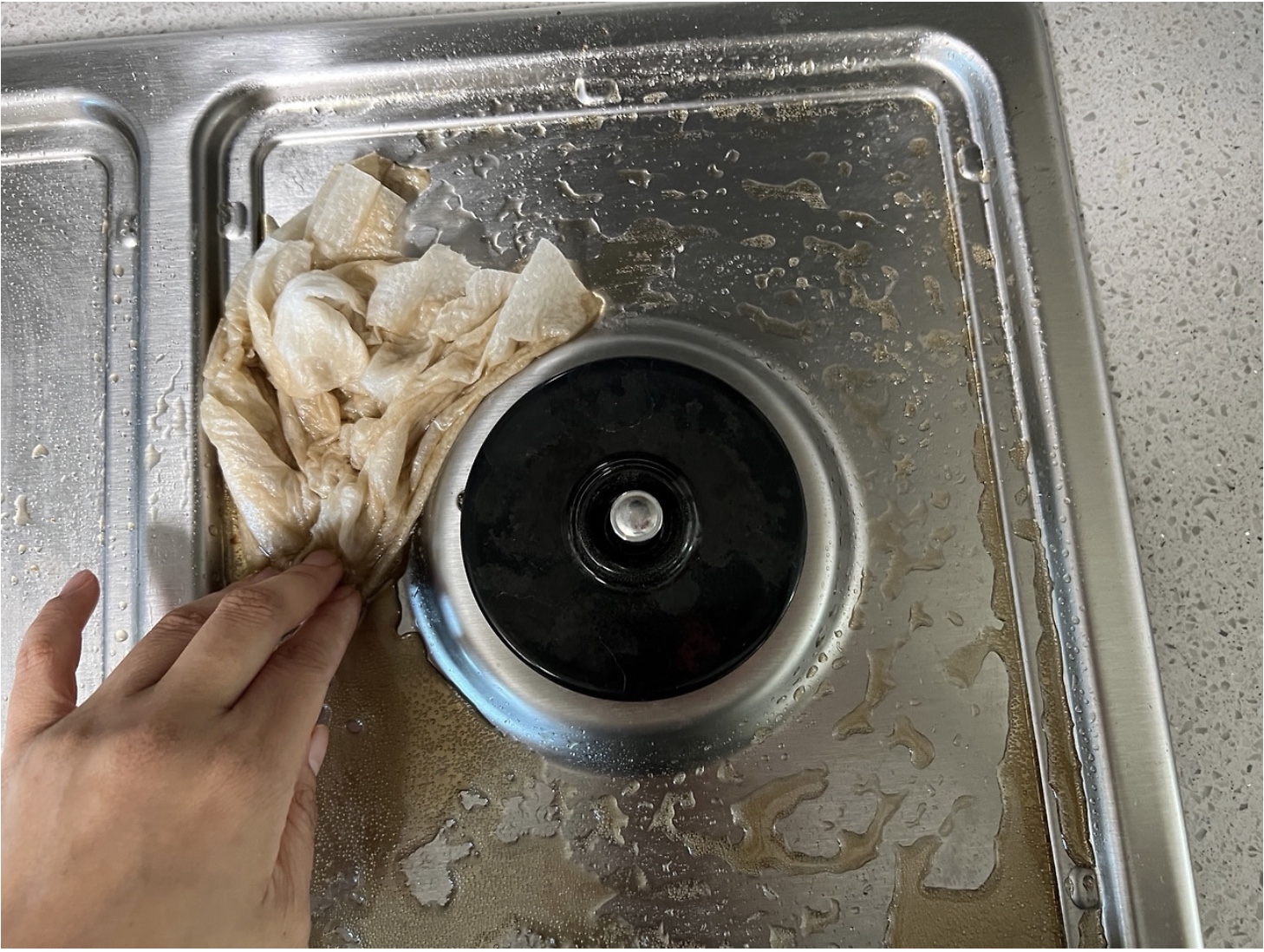 15분 정도 후 키친타월을 떼어내고 슬슬 문질러 닦아줍니다