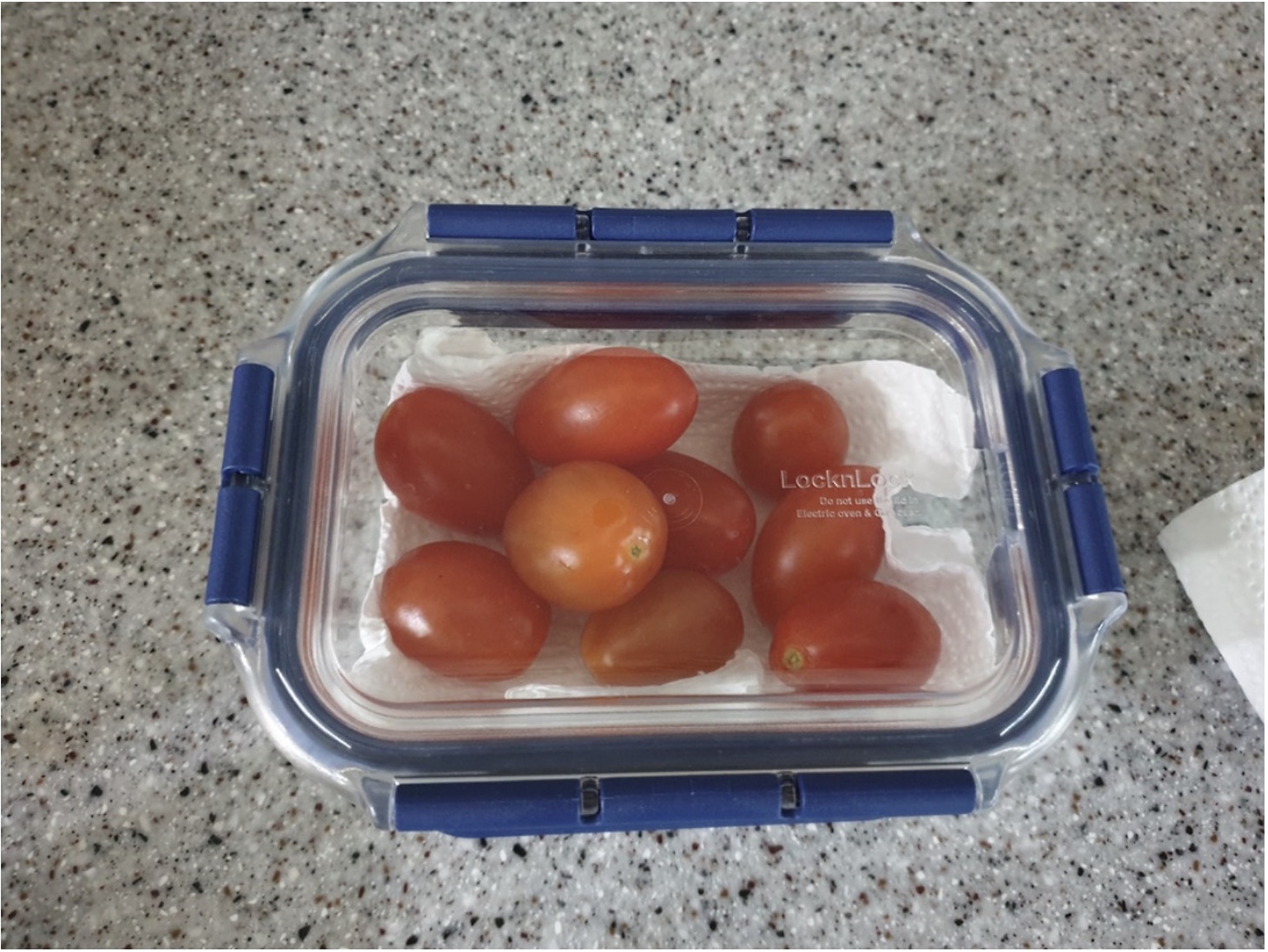3. 밀폐용기에 키친타월 깔고 방울토마토 보관 (냉장보관)