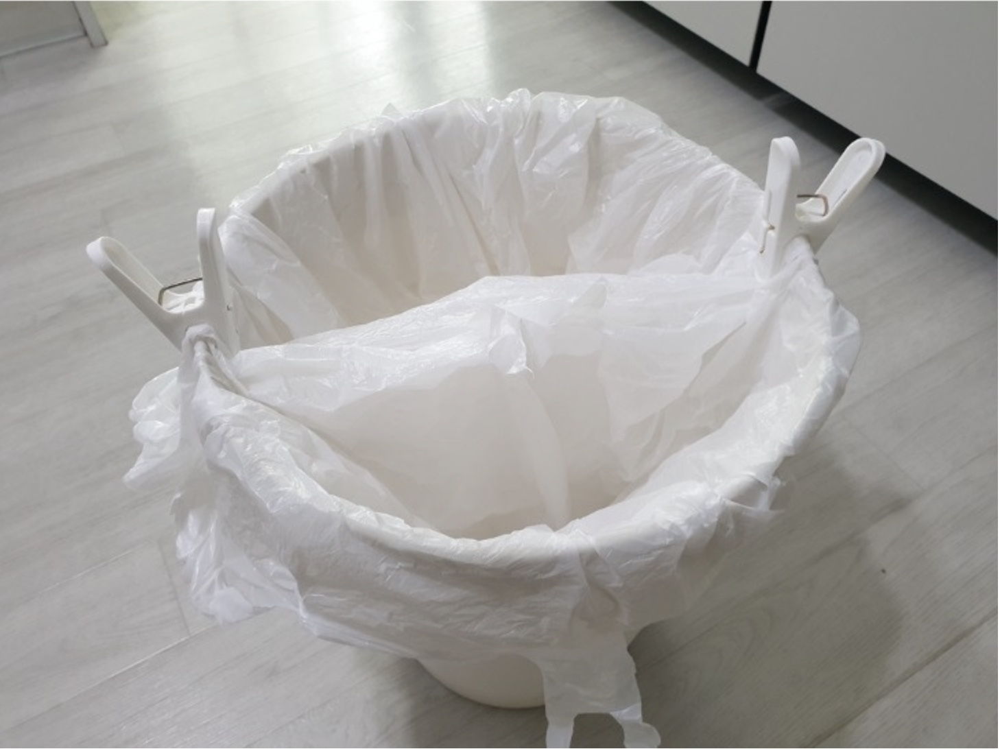 비닐봉지 두개를 쓰레기통에 나눠서 씌우고 빨래집게로 고정해 보세요